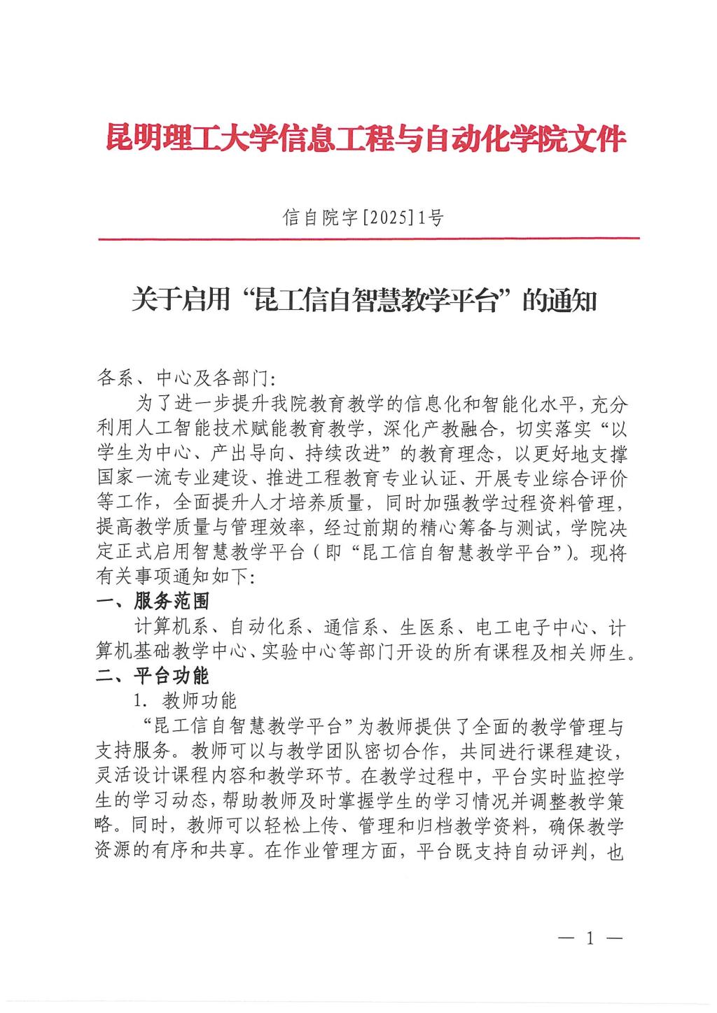 关于启用“昆工信自智慧教学平台”的通知