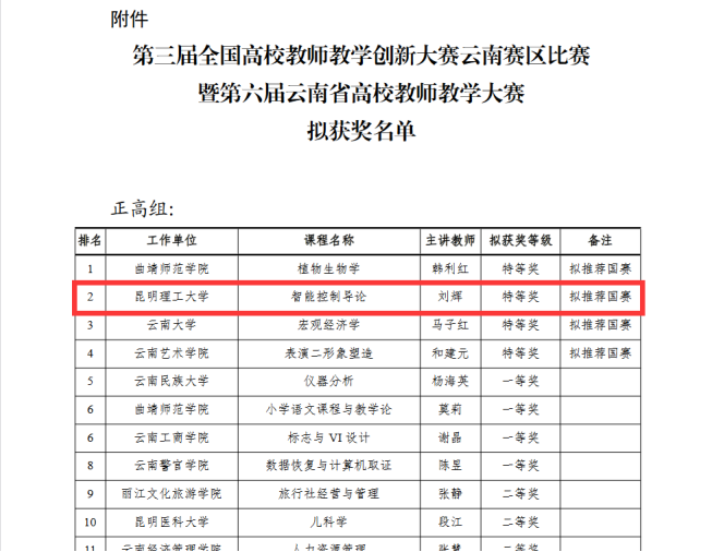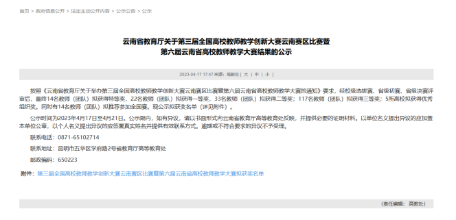 4月17日,云南省教育厅发布了《云南省教育厅关于第三届全国高校教师教学创新大赛云南赛区比赛暨第六届云南省高校教师教学大赛结果的公示》。色花堂
