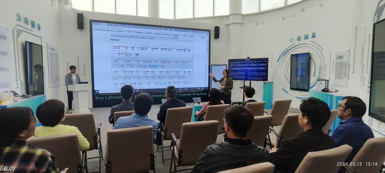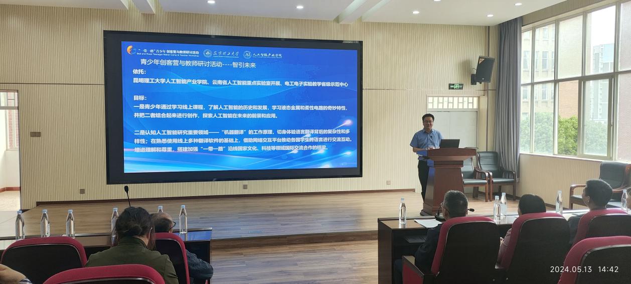 将承办为期一天半的线下活动,为青少年提供展示和交流的平台。会上,学院副院长李恒首先做了题为“第八届‘一带一路’青少年创客营与教师研讨活动——智引未来准备工作汇报”的报告。此报告详细梳理了学院对创客营在线上和线下的准备情况,以及课程安排等各项准备工作。接着,云南人工智能重点实验室执行副主任高盛祥介绍了自主研发的云岭翻译APP,为活动提供实时翻译服务,助力跨文化交流。