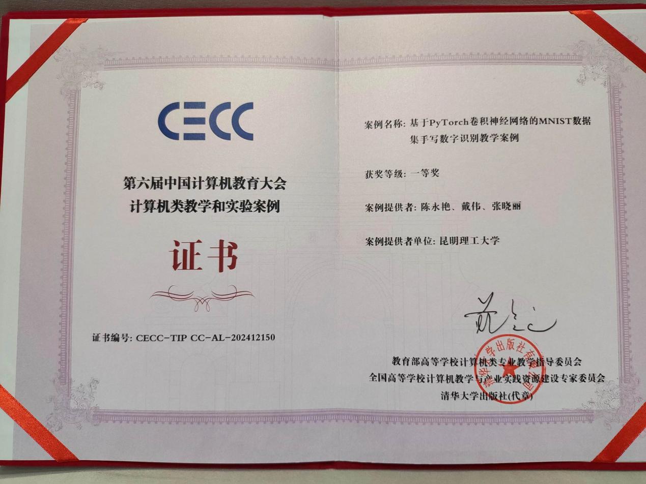 的“基于PyTorch卷积神经网络的MNIST数据集手写数字识别教学案例”和“三层交换机实验案例”两项均获计算机类教学和实验案例一等奖。这两个案例由陈永艳、戴伟、张晓丽老师共同建设完成。