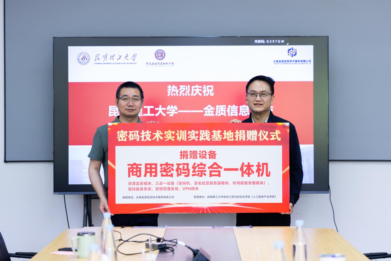 双方一致认为,在数字化浪潮加速演进、国家网络强国战略深入实施的背景下,密码技术作为网络安全的核心支撑,其人才培养已成为保障网络空间安全的关键。此次共建密码实习、实训基地是校企双方响应时代召唤、履行社会责任、深化产学研合作的关键举措。随后,现场举行了庄重的捐赠证书递交、合作授牌及协议签署仪式,标志着“密码技术实训实践基地”的正式落成。
