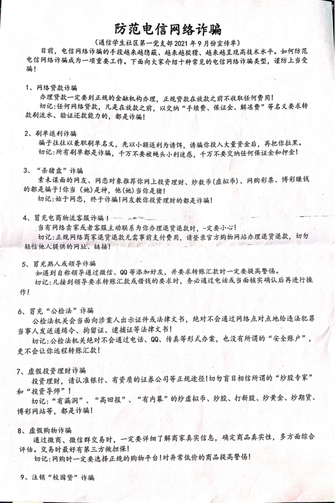 活动现场,党员走访党支部联系的团支书所辖宿舍走访慰问,同时通过向各位党员同志发放《防范电信网络诈骗》安全知识宣传单,指导通信学生社区第一党支部全体党员如何防范网络贷款诈骗、刷单返利诈骗、“杀猪盒”诈骗、冒充电商物流客服诈骗、冒充熟人或领导诈骗、冒充“公检法”诈骗、虚假投资理财诈骗、虚假购物诈骗、注销“校园贷”诈骗以及网络游戏虚假交易诈骗共10种电信网络诈骗方式,使全体党员同志能够在有限的时间里掌握更多防范电信网络诈骗的安全的基本常识,谨防上当受骗。