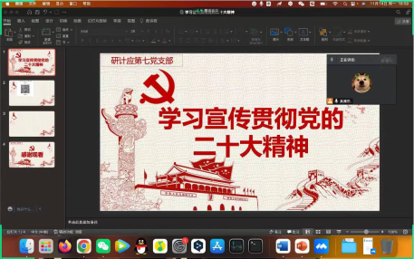 2022年11月14日晚上七点,研究生第七党支部线上开展了本月的“学习宣传贯彻党的二十大精神”主题党日活动。本次活动的参会人员为:研究生第七党支部全体党员。