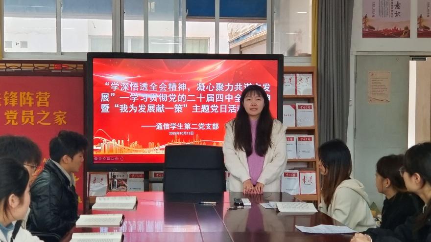 为深入学习贯彻党的二十届四中全会精神,教育引导学校广大党员切实把思想和行动统一到全会精神上来,通信学生第二党支部于2025年11月5日在信自235成功举办了“学深悟透全会精神,凝心聚力共谋发展”--学习贯彻党的二十届四中全会精神暨“我为发展献一策”主题党日活动。此次活动旨在教育引导师生党员深刻领会,准确把握党的二十届四中全会精神的丰富内涵和核心要义,并结合学习工作实际,深入开展研讨交流。