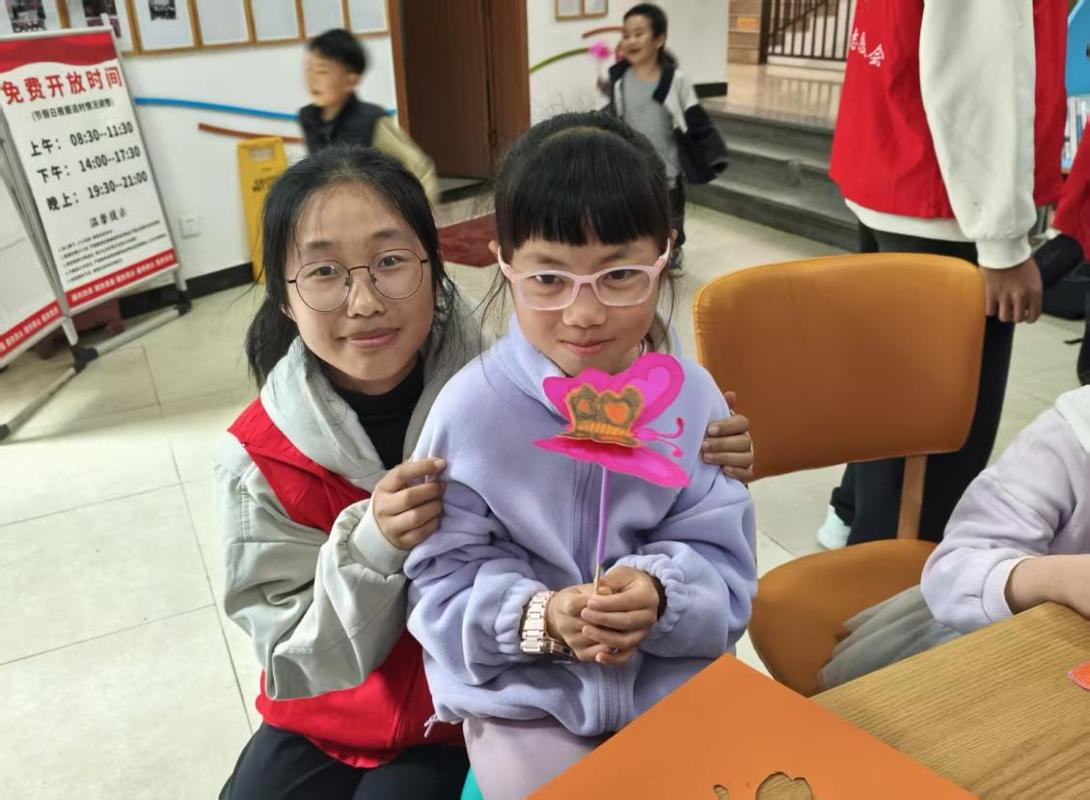 活动开始前,志愿者组织小朋友坐在座位上并分发相应的彩纸画笔等。在制作环节中,小朋友们充分发挥想象绘画出自己的“会飞的蝴蝶”,志愿者协助小朋友们完成裁剪以及胶水的使用,保障活动安全有效的进行。活动中,孩子们神情专注,志愿者耐心守护,一只只形态各异色彩斑斓的蝴蝶在孩子们手上成型。最后孩子们手持作品与志愿者们合影留念,共同记录下这美好的时刻。