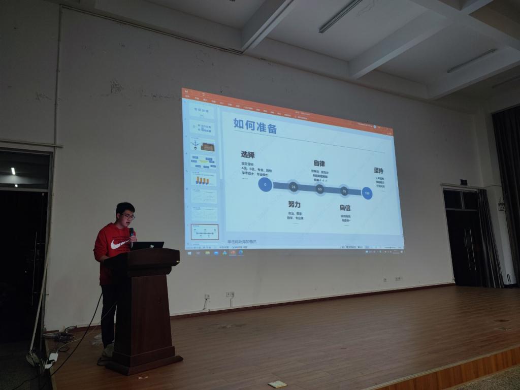 分享会中,学生就自己的保研历程、考研历程以及在备考过程中应当注意的事项与在座同学们进行了交流。同时,分享的学生根据个人经验总结了备战考研过程中需要注意的问题,强调主动搜集考研信息,端正学习态度,提高学习效率,坚定学习目标,脚踏实地,一步一步的走下去的重要性。